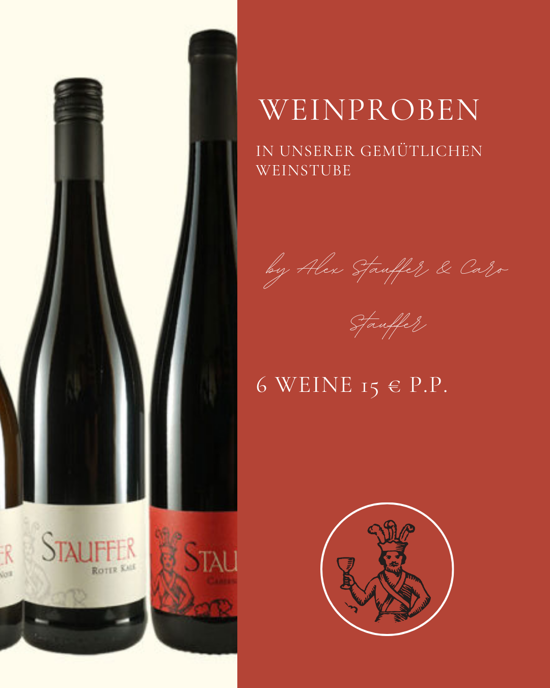 Genießt eine Weinprobe mit sechs Weinen in unserer 400 Jahre alten Weinstube.